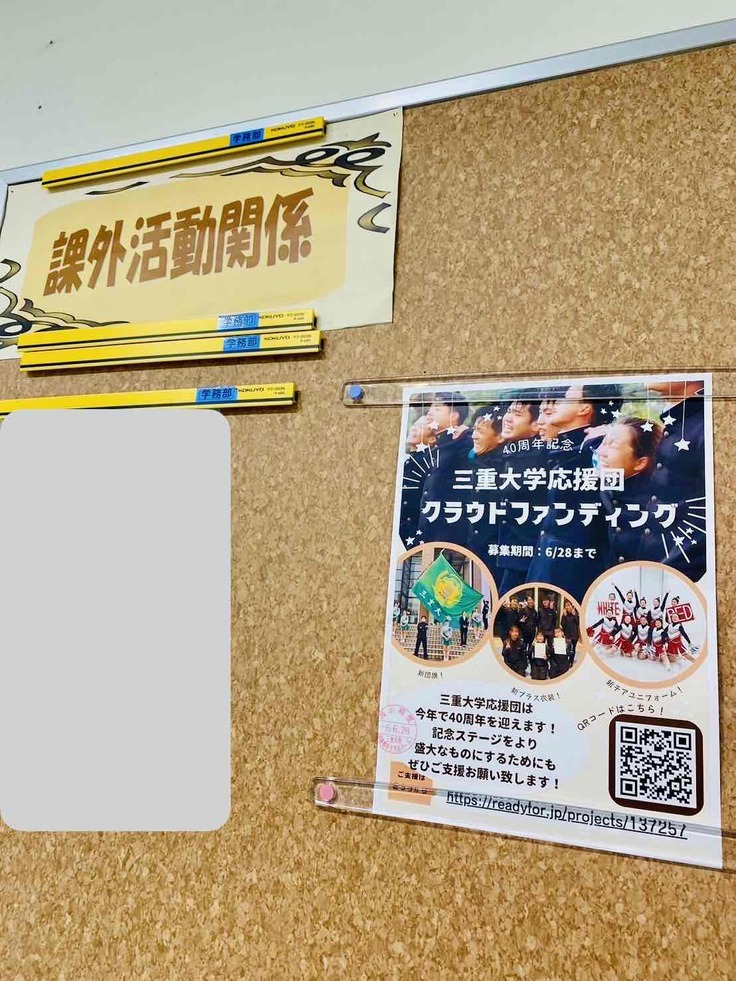 クラファンのチラシは、三重大学内の学務部事務所、図書館、各学部棟に掲示しています。