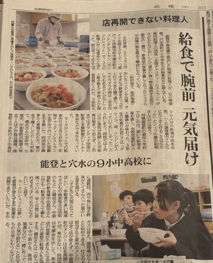 (北陸中日新聞令和6年2月8日朝刊より、川嶋氏が参加している給食支援の活動の記事)