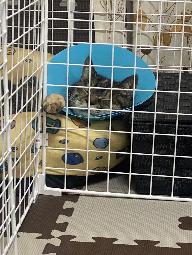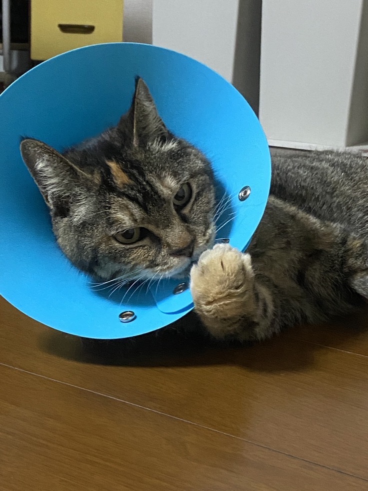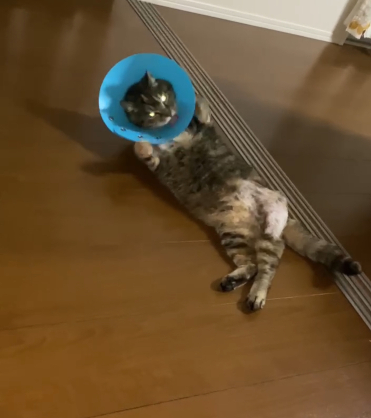 もう少しの間、首のカラーはそのままですが、歩くリハビリも頑張っていて まだ少しぎこちないですが、部屋中を自由に歩きまわれるほどになりました。
