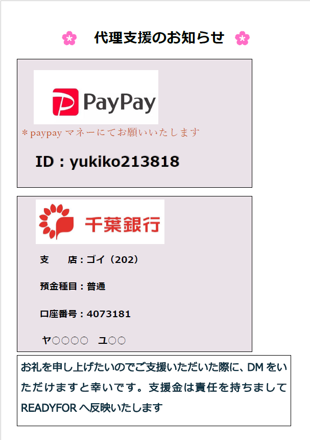 ①. 支援者様が指定の銀行口座又はpaypayにご送金