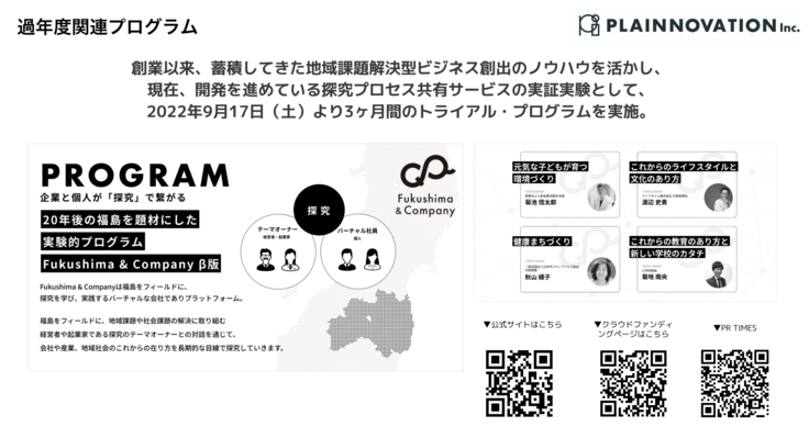 そのような背景の下、2022年には地域企業と社会人の方を対象に探究力育成に向けたトライアルプログラムした、「Fukushima & Company β版」を2022年の9月前半から12月前半の約3ヶ月で実施いたしました。クラウドファンディングの支援者は55名もの方に支援をいただき、うち23名はトライアルプログラムの参加権を支援として選択いただきました。