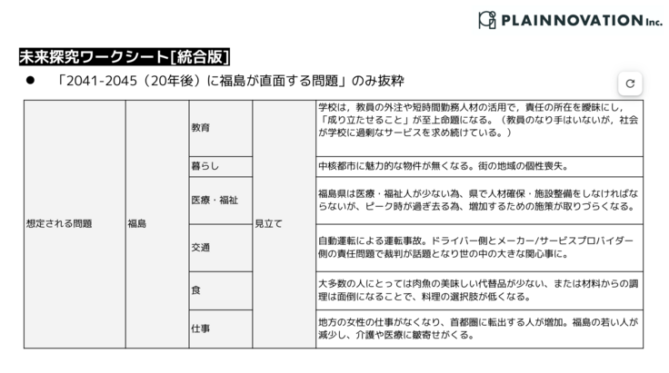 例えば2022年のトライアルプログラムで取り組んだ「未来探究」では、6つの領域に関する「20年後に福島が直面する問題」が見えてきました。