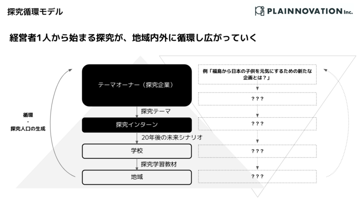 そのような現状の中で、私たちは地域の中で日々様々なステークホルダーや社会、環境に向き合いながら探究を行う企業経営者に起点をおき、企業経営者の探究テーマが大学生、高校生、そして市民へと循環しながら伝わり進化していくモデルが作れるのではないかと考えるようになりました。