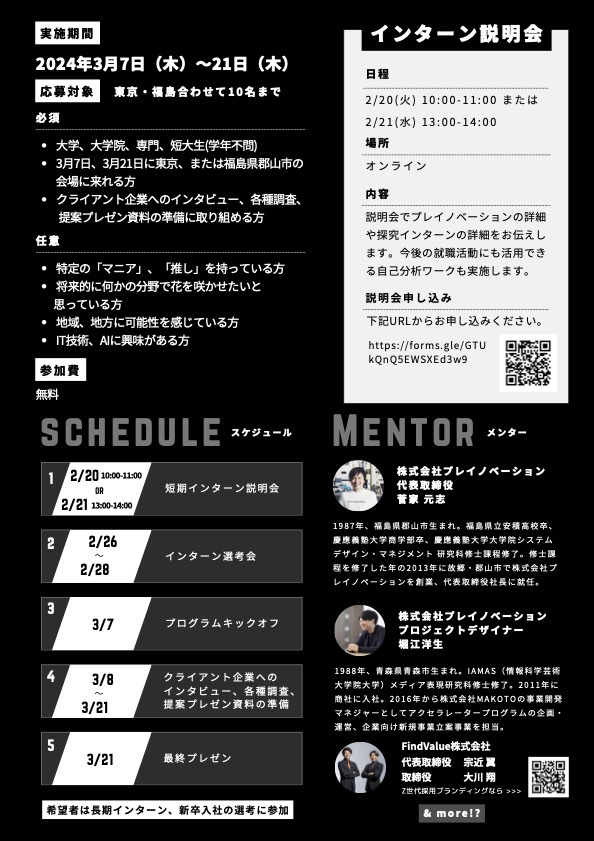 トライアルプログラム「Fukushima & Company β版」を通じた学びを引き継ぎながら、さらに地域の探究実践を推し進めるため、「自身が探究するテーマをもとに多様な人と意見交換し、事業が推進する対話やアイデア、パートナーを得ていくことはできないか?」「本来、出会いそうにない組織や人と出会うことができる生態系を生み出せないか?」といった大きな問いを持ち、2024年の新たなプログラムとして探究インターンシップを立ち上げます。