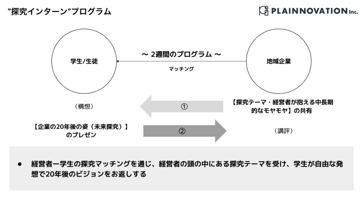 本プログラムは、地域企業経営者と学生との「探究マッチング」を通じて、経営者の頭の中にある探究テーマを受け、学生が自由な発想で20年後や100年後のビジョンをお返しするプログラムです。