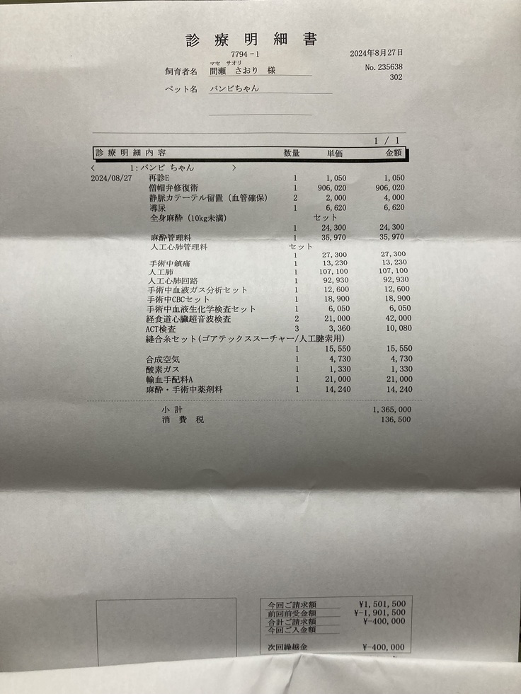 昨日の退院の時に手術費、入院費の支払いが完了しました^_^