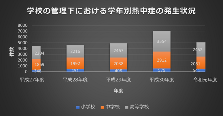 地球温暖化の影響か、全国の学校管理下における熱中症は、増加傾向にあります。また、物価上昇により教育費の増加、この様な事から学校にかかる負担は増すばかりです。しかし生徒の安全は第一で、気温が高ければスポーッ中止ともなりかねません。最近の甲子園でも見受けられますが、試合の途中に休息時間を設け水分補給が行われています。熱中症は、野球、サッカーなど屋外のスポーツに限った事ではありません。しかし、生徒には好きな部活は行ってほしい。