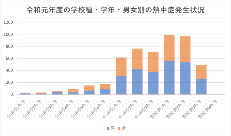 小学校、中学校、高等学校学年男女別に熱中症発生状況です。