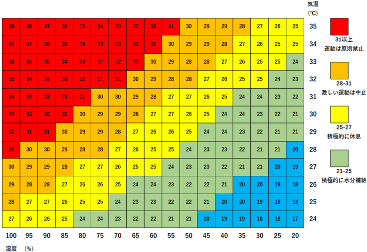 例えば気温29度 湿度70%の場合 暑さ指数28度です。オレンジ色は激しい運動中止