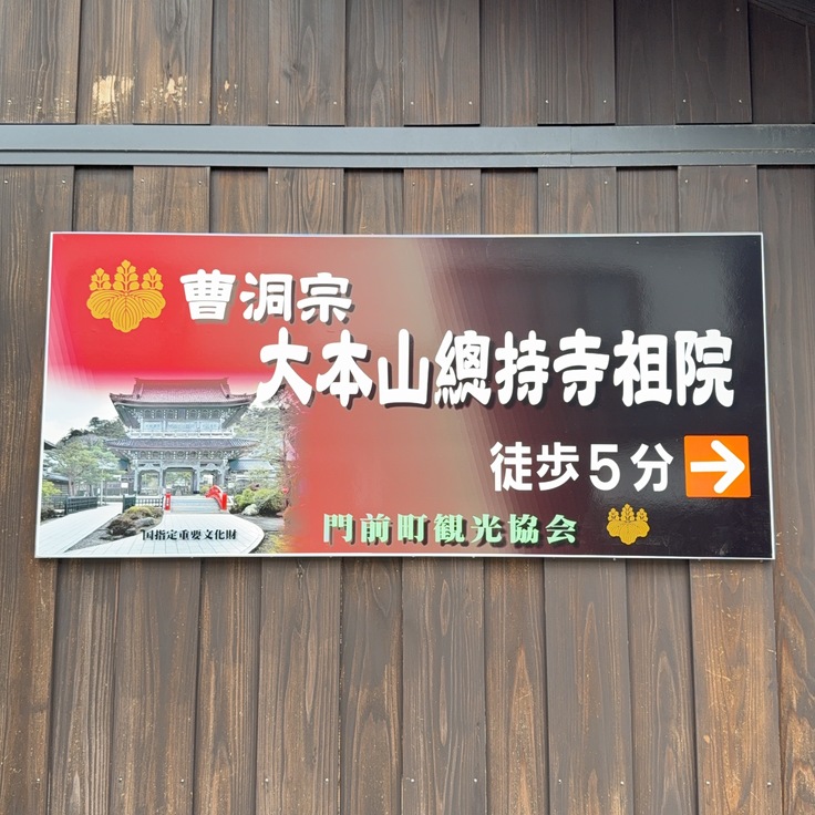 (画像は總持寺祖院への案内看板設置の様子です。総持寺通り商店街にある笑楽路屋さん「観光案内所」に設置。)