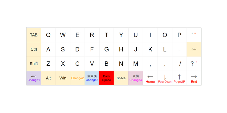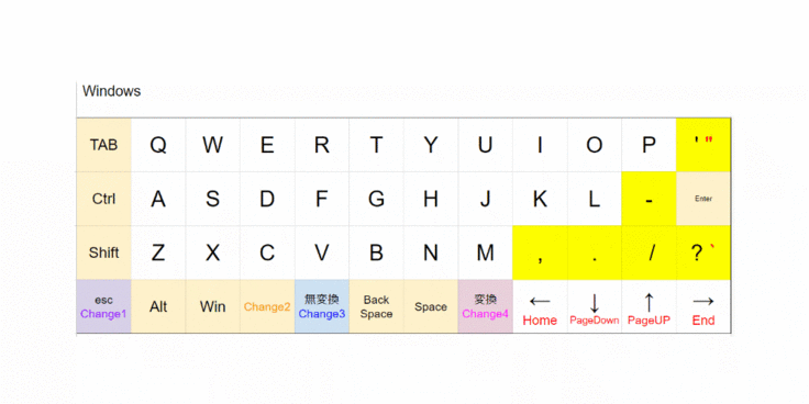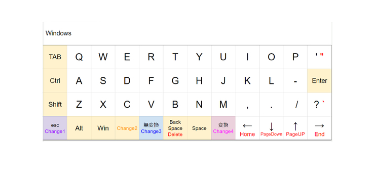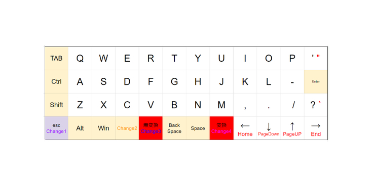【無変換】【change3】、【変換】【change4】は同じキーであり、長押しすると【change3】【change4】キーとして機能し、クリックすると【無変換】【変換】キーとして機能します。これによりwindowsの設定で無変換をIME-OFF、変換をIME-ONに設定することで、MacOSのような挙動でタイピングする事が可能です