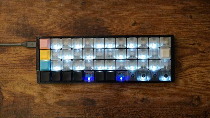 LEDライトは白で格子状に配置されています。又、【change3】【change4】に配置されているLEDライトは視覚的にどこが親指のホームポジションなのかわかりやすいように青色です。