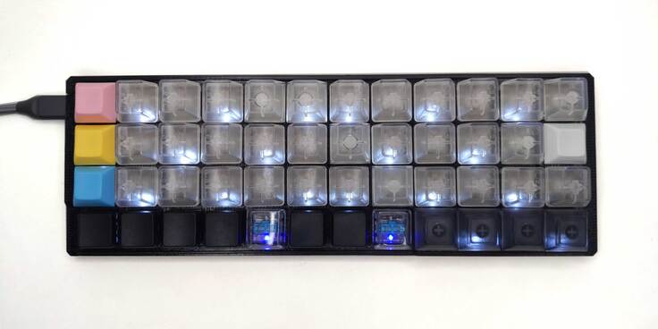 最下段のキースイッチはロープロファイルと呼ばれる薄いタイプのキースイッチを使っております。理由は最下段のキーは主に親指を使って入力するのですが、ロープロファイルのほうが指に対する負担が減るからです。