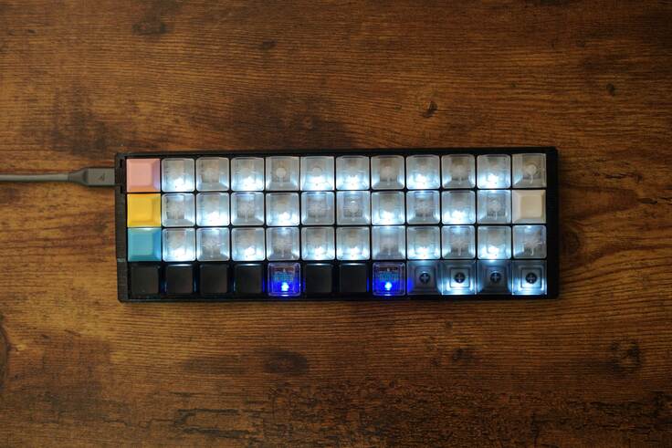 ※ロープロファイルの部分のキースイッチは(青色のキースイッチの部分)はKailh choc blue 押し出し圧25gのリニアキーで固定です。