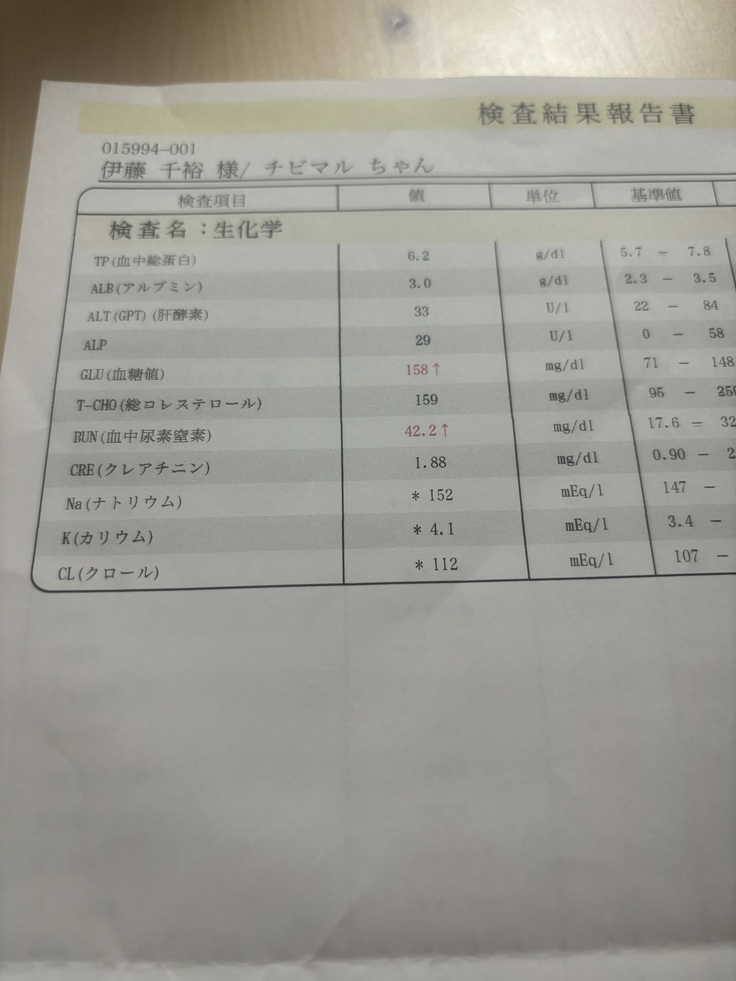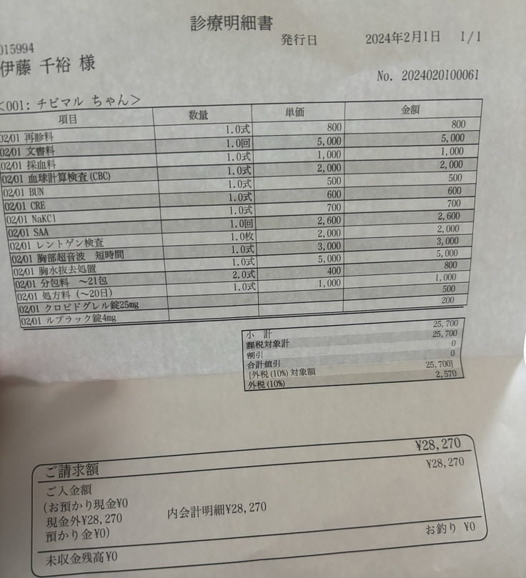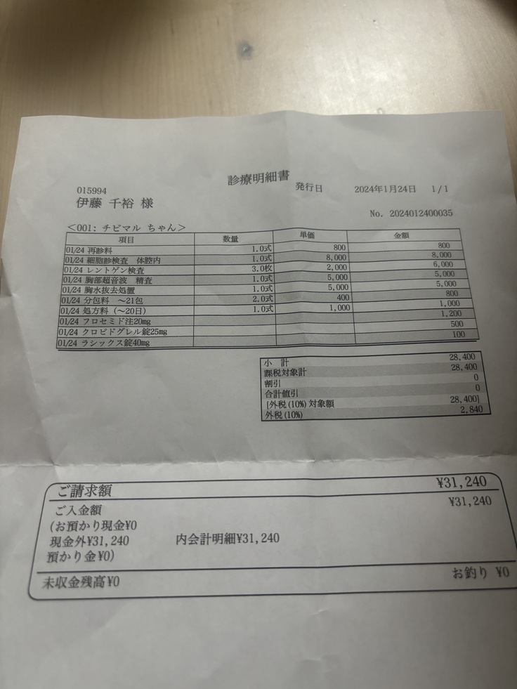 先ずは応急処置として、胸水を注射で抜いていただきました。小さな体で頑張ってくれたと思うと胸が痛いです。