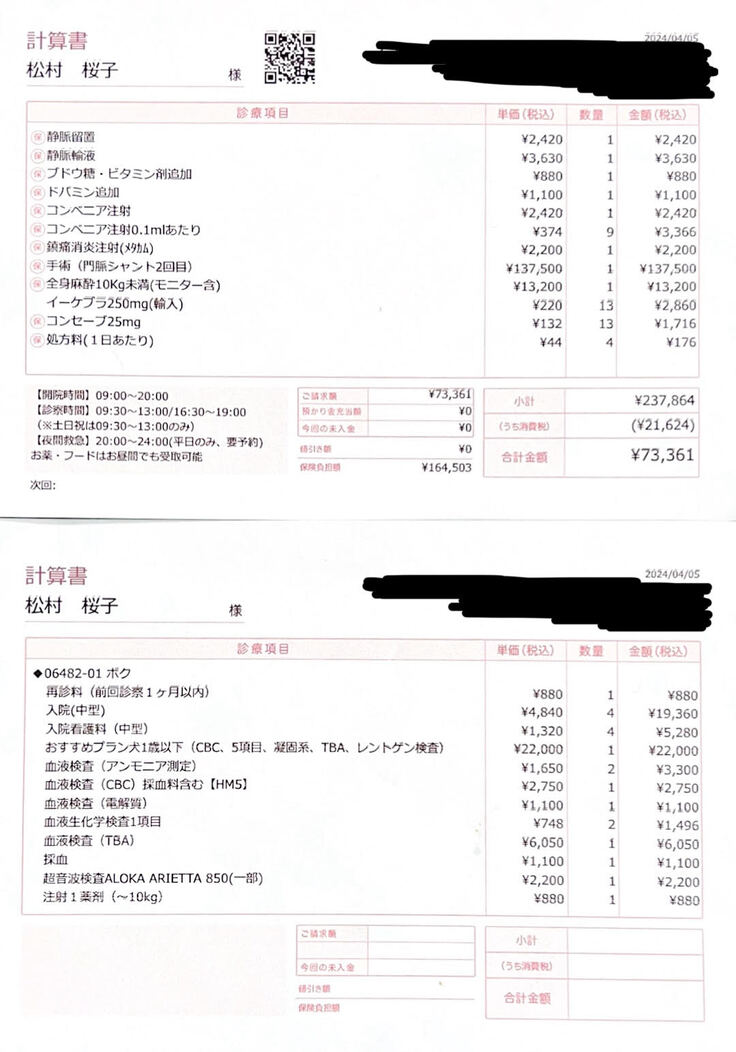 門脈シャント手術2回、CT検査、血液検査、肝臓サポート療養食など