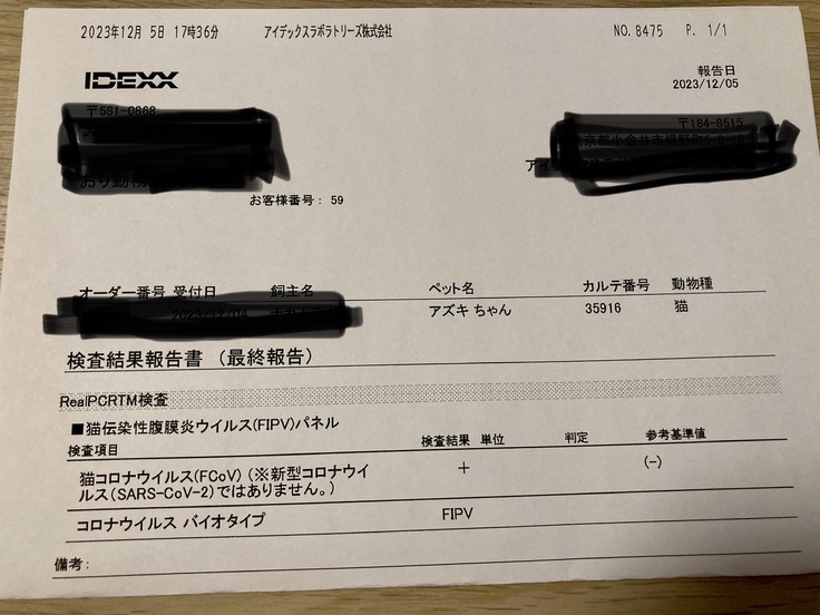 昨年11月後半様子がおかしくご飯も食べなくなり大好きなおもちゃで遊ぶ事もしなくなりました。かかりつけの病院で検査をすると猫伝染性腹膜炎の疑い(ウェットタイプ)があると、子猫がかかると発症より10日間位でも厳しい状態になる可能性もあり確定診断は1週間後でしたが、症状から見て間違いないと