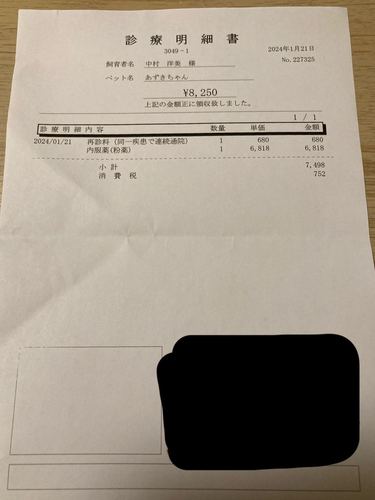 12月5日より翌月1月20日までは1日約3520円(税込)の投薬治療、その後血液検査も特に問題なかったため22日からはお薬の変更許可が出て1日薬約570円の薬になりました(粉薬のため若干の値段の誤差あります)