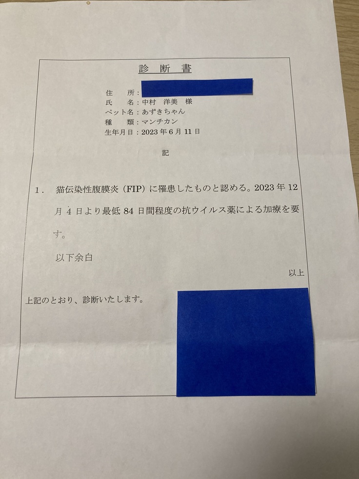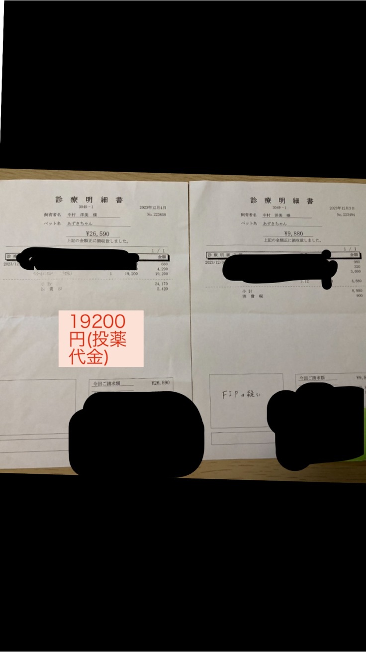 元気に過ごしてましたが2ヶ月後の11月中頃より突然元気がなくなりご飯も食べなくなりました。病院行くと初めは風邪との診断で抗生剤の処方してもらいましたが全く改善せず再度連れていきお腹の膨らみが気になったためレントゲン撮って腹水が溜まってるとの事で詳しく検査してもらった所猫伝染性腹膜炎(FIP)との診断、この病気は特に子猫、老猫がかかりやすい病気です。効果的な治療が難しく投薬が長期になり(84日)ペット保険も効かないため高額になります。