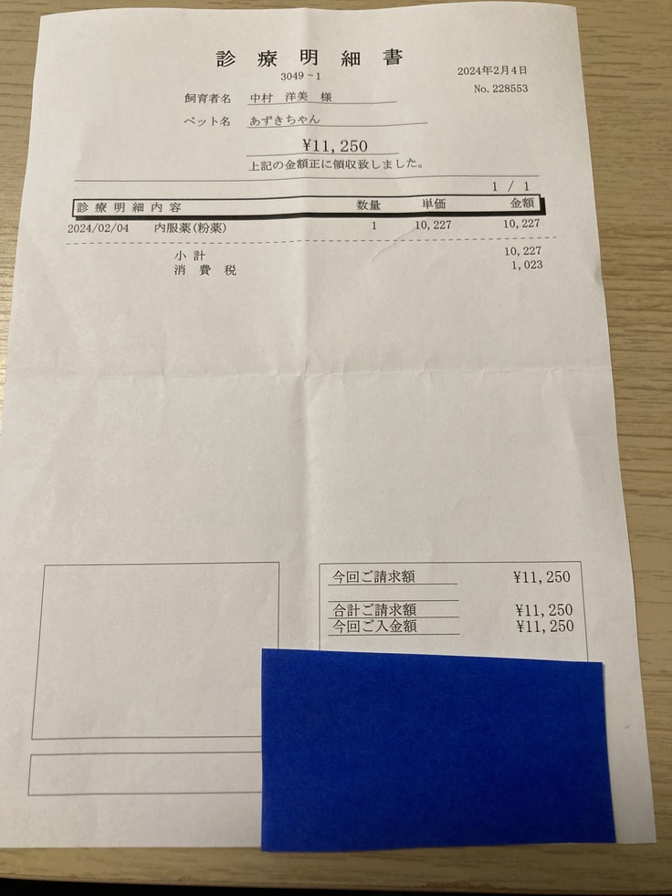 現在経過観察のため月に1度血液検査かかっております。投薬は後半1部ペット保険が効いたため効いた分は差し引いております。