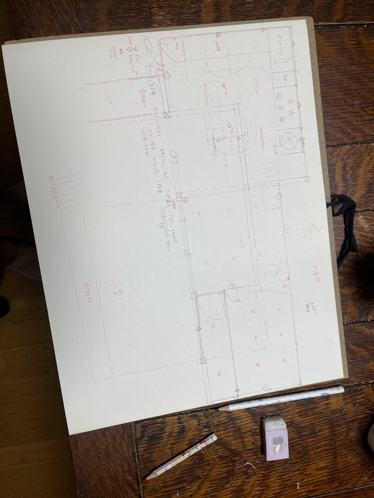 本来ならば見えない部分も見えるようにしてから、しっかりと全体を精密に図面は仕上げられる物だと思いますが壁をはいでは無いはずの主要な柱が出てきたり、あるはずの物が無かったり、広い敷地にわざわざ変な作りをしていたりと徐々に図面の下書きが出来て行くと言う。