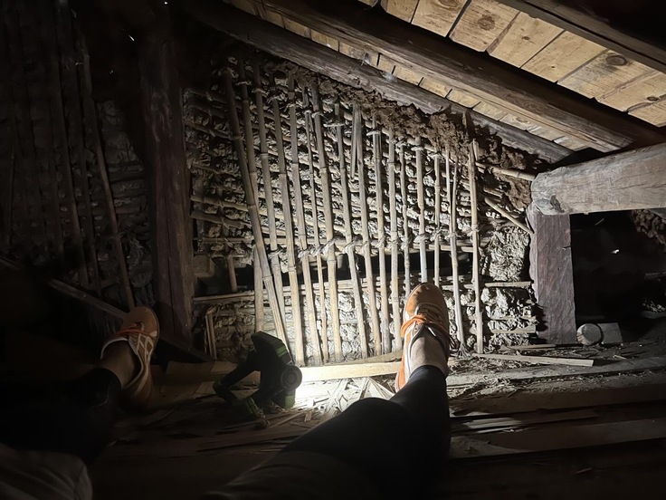 80年経過した杉板は飴色に仕上がりとても強固でそのまま使用したかったのですが土壁の土や屋根裏の住人の排泄物、巣に持ち帰った枝や葉っぱが溜まりどれが土でどれがゴミが分からず掃除出来なかったので剥がしてから新たに立ち上げるようにします。