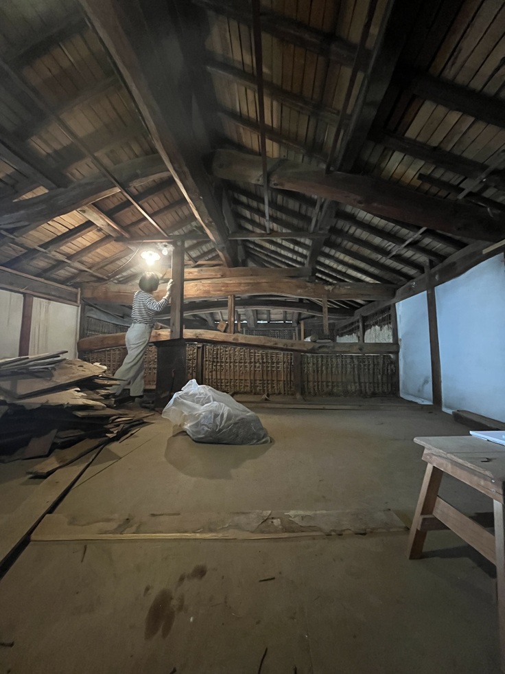 ②2階屋根裏と和室天井裏の仕切り壁板を取る