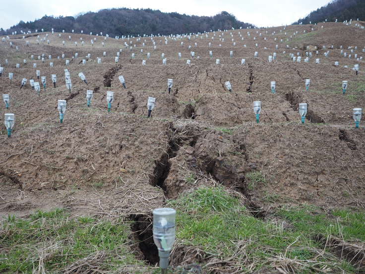しかし、令和6年1月1日16時10分、石川県能登地方を震源とするM7.6の大地震により、私たちの暮らす輪島市は甚大な被害を受け、白米千枚田も大きなダメージを受けました。棚田には幾筋もの深い亀裂が入り、地下水は地上に溢れ、農業用水も土砂や倒木で破壊されました。このままでは、この先米作りをできる状態ではありません。さらにこのまま放置しておくと、余震や大雨の影響でどんどん亀裂は広がり、深さを増し、修復不可能な域に達してしまうため、待ったなしの対応が急がれます。