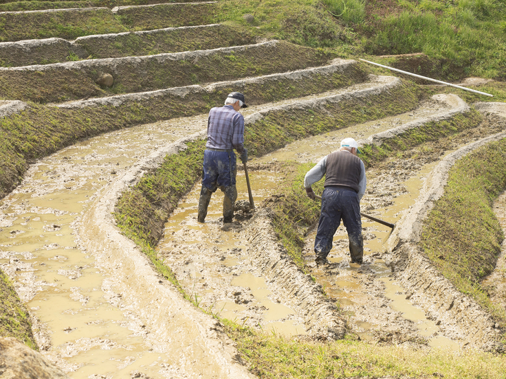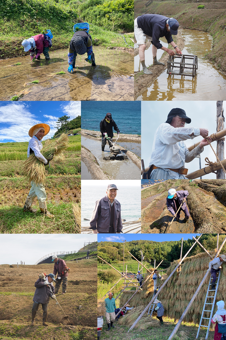 千枚田の耕作は大型機械が入らないので、鍬や鎌を使った昔ながらの手作業を実践しています。人手は5倍も6倍も掛かりますが、愛しさも倍以上。声を掛け合いながら、手をかけ暇をかけ、米作りに励んでいます。