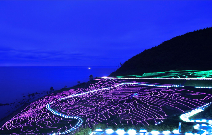 水を張った棚田に映える夕日、青空に伸びる走り穂、黄金色に染まる稲穂の絨毯など、四季折々で違った表情を見せてくれます。10月から3月にかけてはLED(太陽光発電)によるイルミネーションイベント「あぜのきらめき」を楽しむことができます。