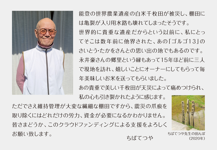 そしてこの度、千枚田オーナー制度の特別名誉会員、漫画家のちばてつや先生から応援メッセージが届きましたので掲載させていただきます。(プロジェクト本文へも掲載いたします)