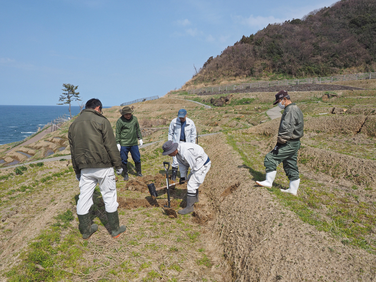 修復は人力で行うところ、重機を入れなければどうしようもないところがあります。人力で行うところはクワやバイ(木槌)を使って地道に進めていくしかありません。一つ一つの亀裂を地道に埋めていきます。