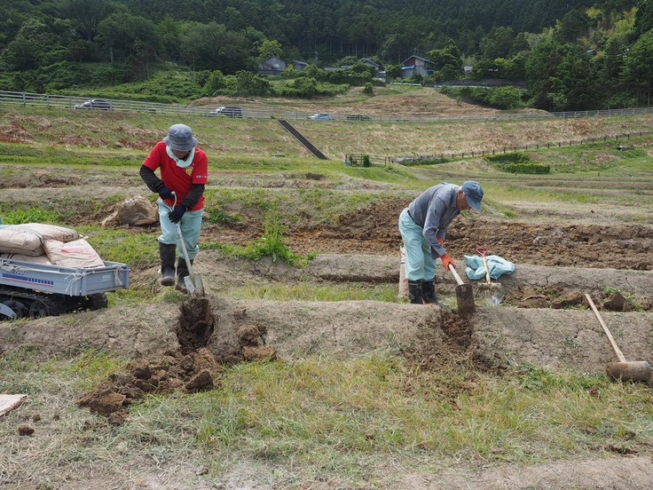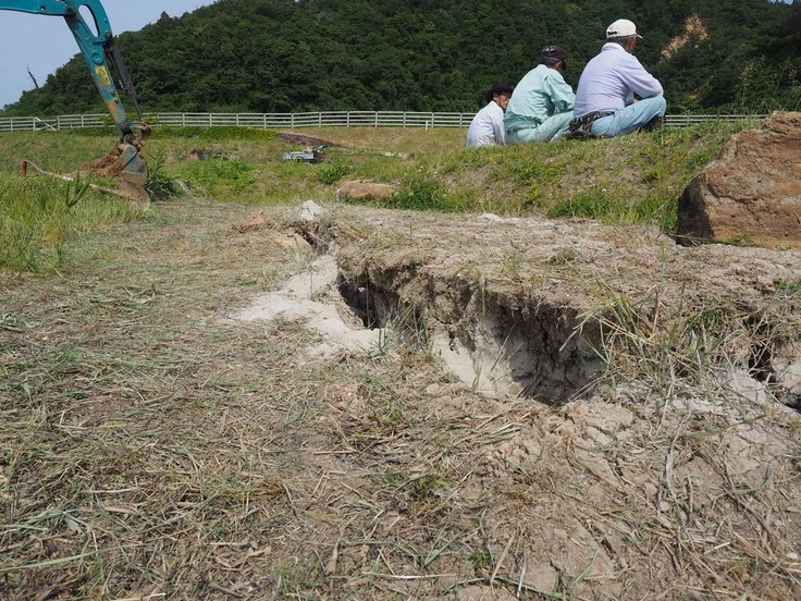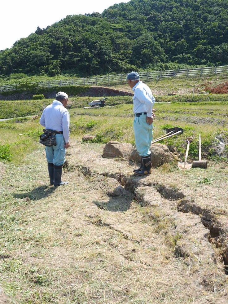 今年、修復→作付した田んぼも、水を張るとどこからともなく水が漏れ出てしまっていました。その経験から、目に見える亀裂を直した後は、作付しなくても実験的に水を張って耕してみる。土を細かくドロドロにし、亀裂を塞いでいく、というのが有効ではないかとのことでした。
