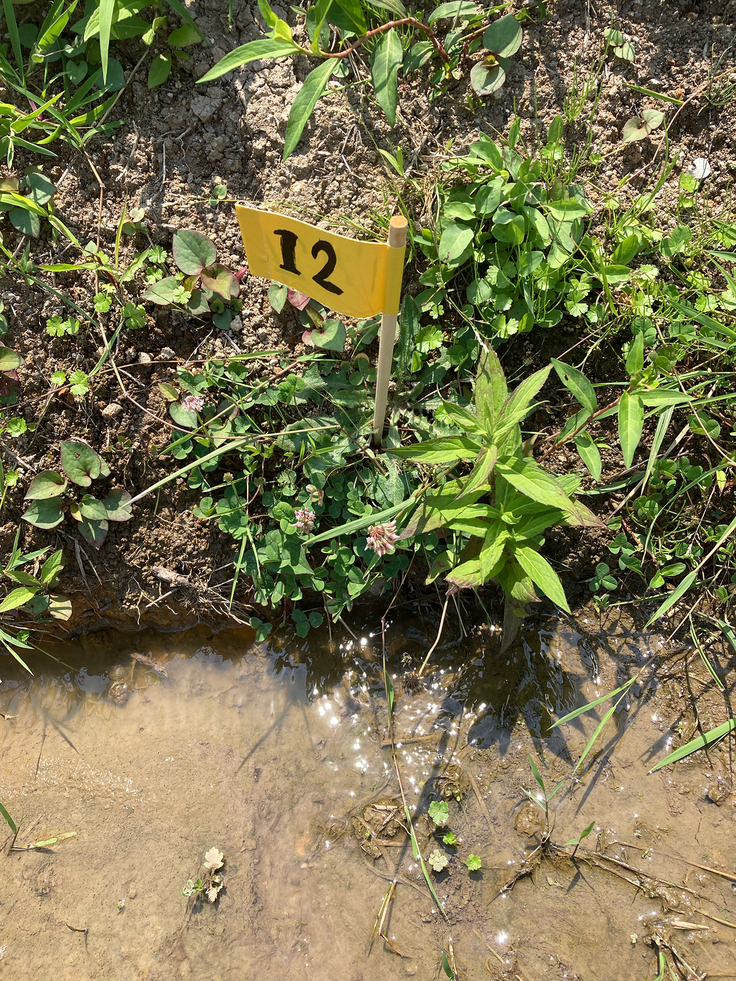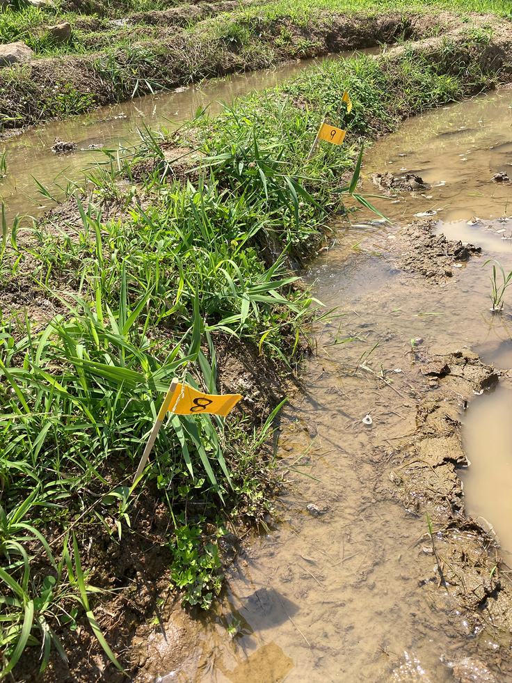 水漏れを起こしている箇所には、場所と数を把握するため、旗を立てていきました。(目に見える土手しかチェックできませんが、もしかすると田んぼの中でも漏れが直っていない箇所があるのかもしれません)