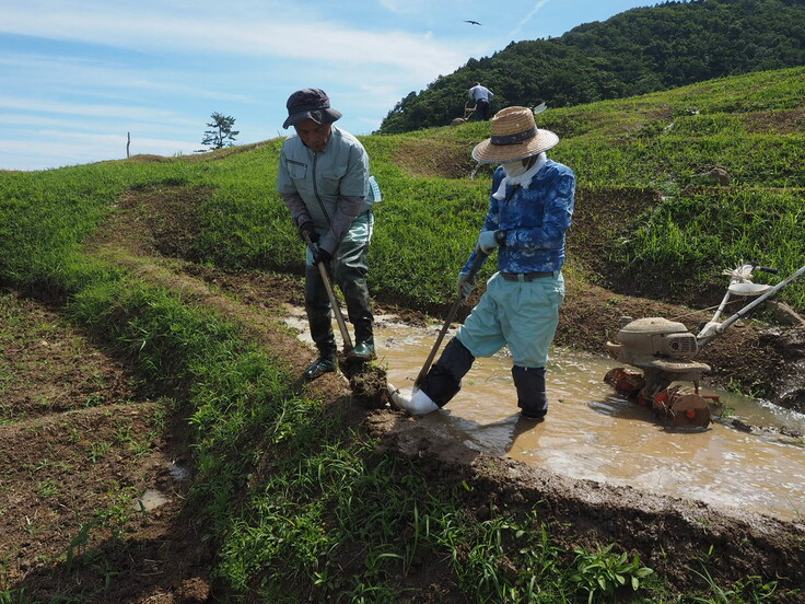 畦が下がってしまい、水が漏れ出てしまっている田んぼも多いため、畦にも気を配りながらの修復。低くなった畦は、土を盛り付けて高くします。