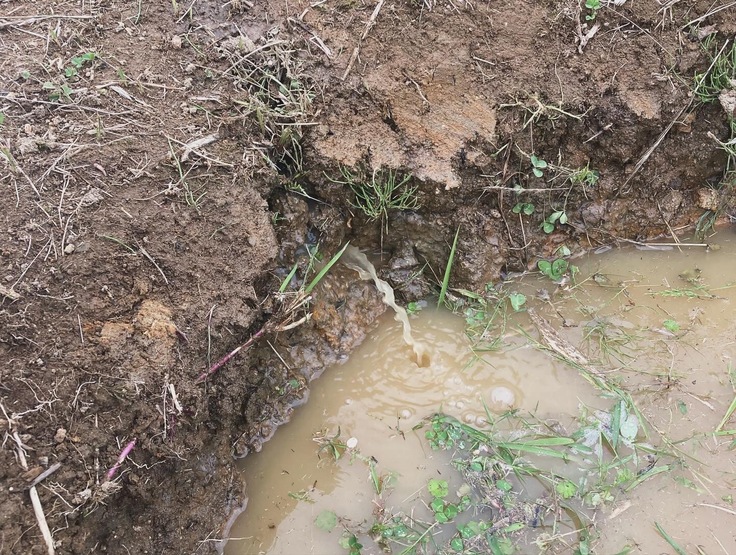 土手から水が漏れ出ている。漏れたところを掘ってみると地中深くに亀裂が走っていたりする