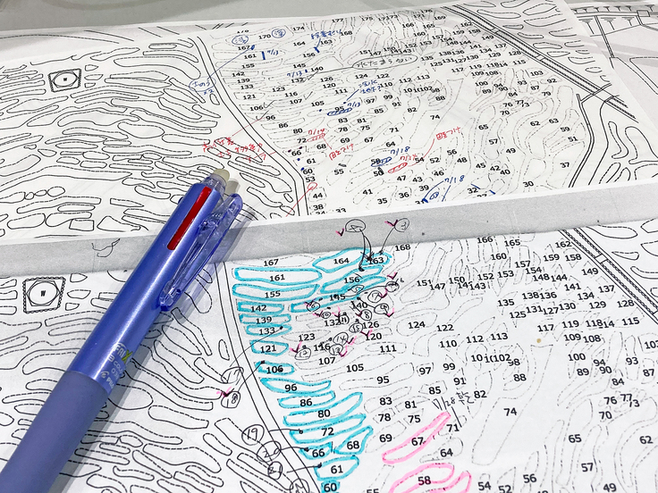 漏れ出ている箇所を図面でもチェック。100枚程の田んぼのうち、漏れが止まらないのは28箇所あった(目視できる範囲)