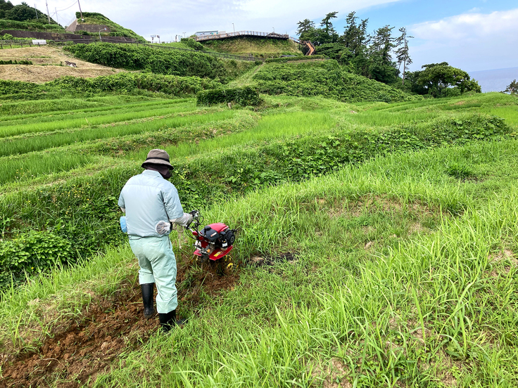 地震の被害で休耕田になっている田んぼを小型耕運機で耕す