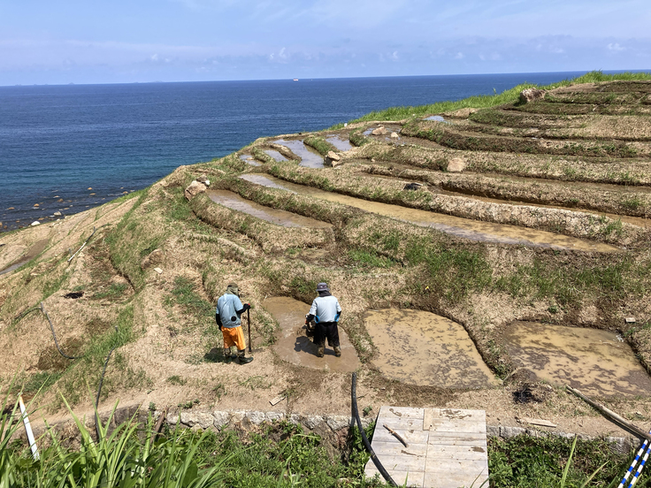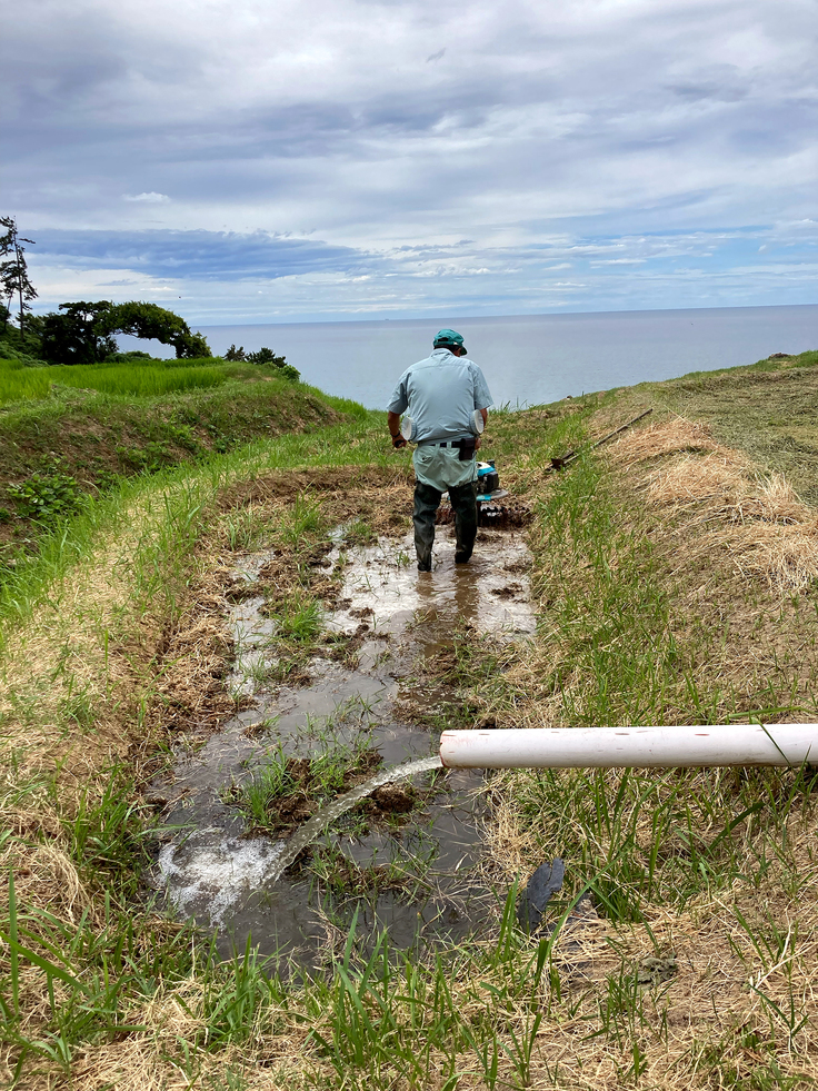 なんとか「耕作」「修復」の両方が行えるよう、修復作業の開始前の朝には、修復予定のエリアに水を引き込み、作業が終わる夕方には、耕作中の田んぼに水を引き込む。そんなことを繰り返しながらなんとかやり過ごす。本当に水の分配に苦心した夏でした。