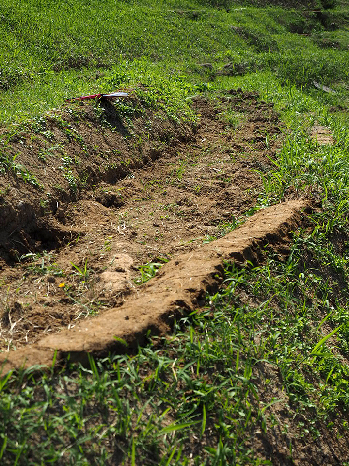 揺れでなだらかになった土手を削り、小型耕運機が入るような幅に調整