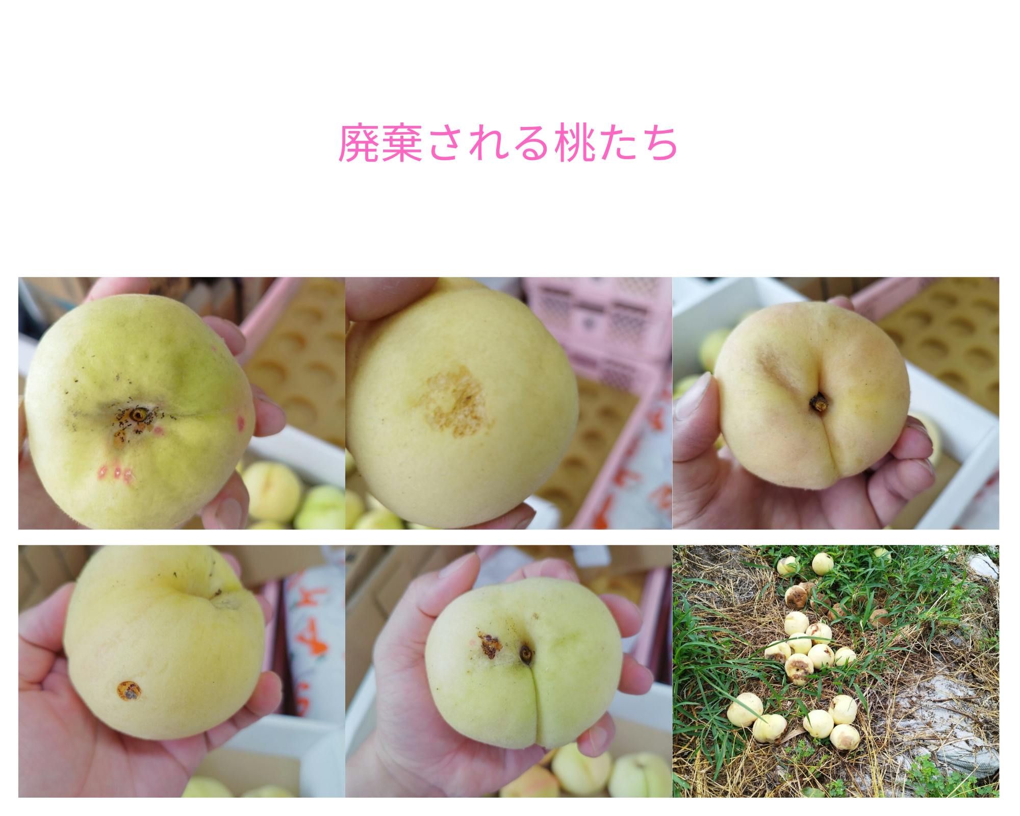 しかし、2023年は極度の不作、県全体的にも不作の年となりました。原因は未だわかりませんが、近年の異常気象、温暖化が関係していると思います。近年この状況は特に清水白桃で続いていました。その中でも当園は独自の栽培方法で、安定した収量を維持していましたが、今年に限って言えば、清水白桃は収量全体の半数近くが規格外となる危機的状況になってしまいました。規格外と言っても、パッと見ためではわかりずらく、虫食い、変形、小玉、枝あたり等で自宅で食べる分には全く気になりません。しかし、岡山白桃の高品質を維持するには、廃棄せざるを得ない桃が沢山出てしまいました。毎日、畑へ廃棄するのも辛く、涙が出る日々が続いておりました。