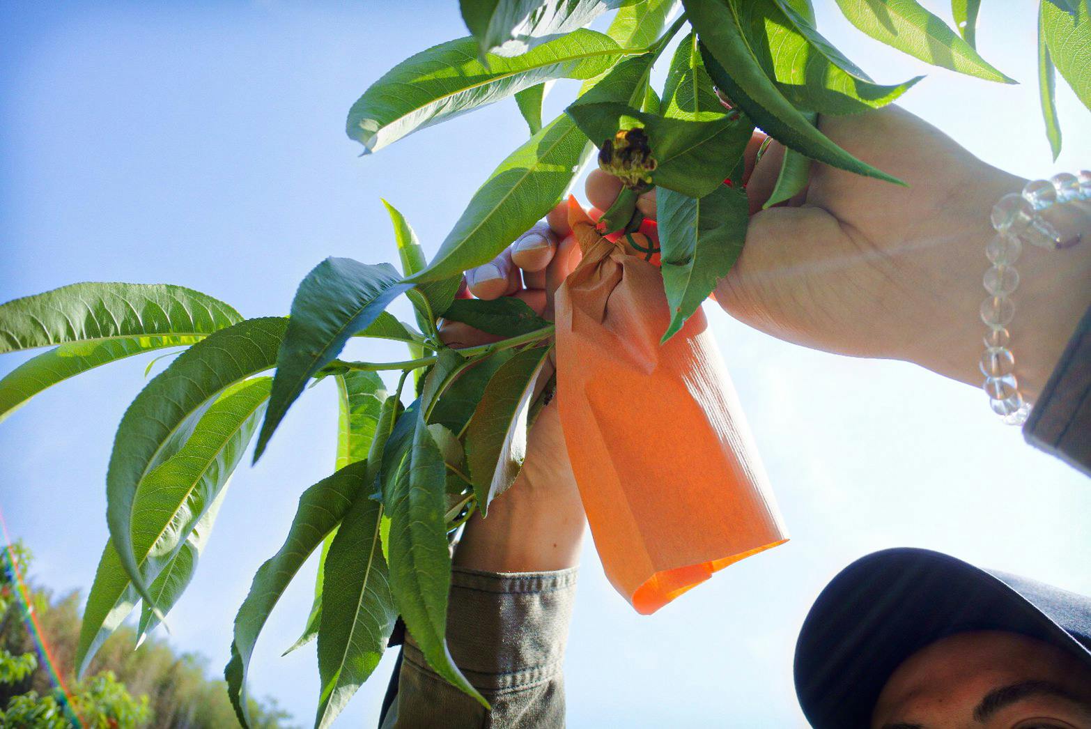 斜面栽培の為、除草剤を使用すると土壌流出に繋がります。農薬散布作業についても、畑に機械が入りにくく、農業事故に繋がるリスクもあることから、物理的に困難です。その為、必要最低限の農薬使用になっており、ロスも一定数ありますが、身体に優しい桃作りにこだわっています。岡山では昔から害虫から守ったり、農薬を減らすための工夫として、桃袋をかけて栽培をする「袋掛栽培」という方法が伝承されています。こうすることで、桃を守ることができるのです。