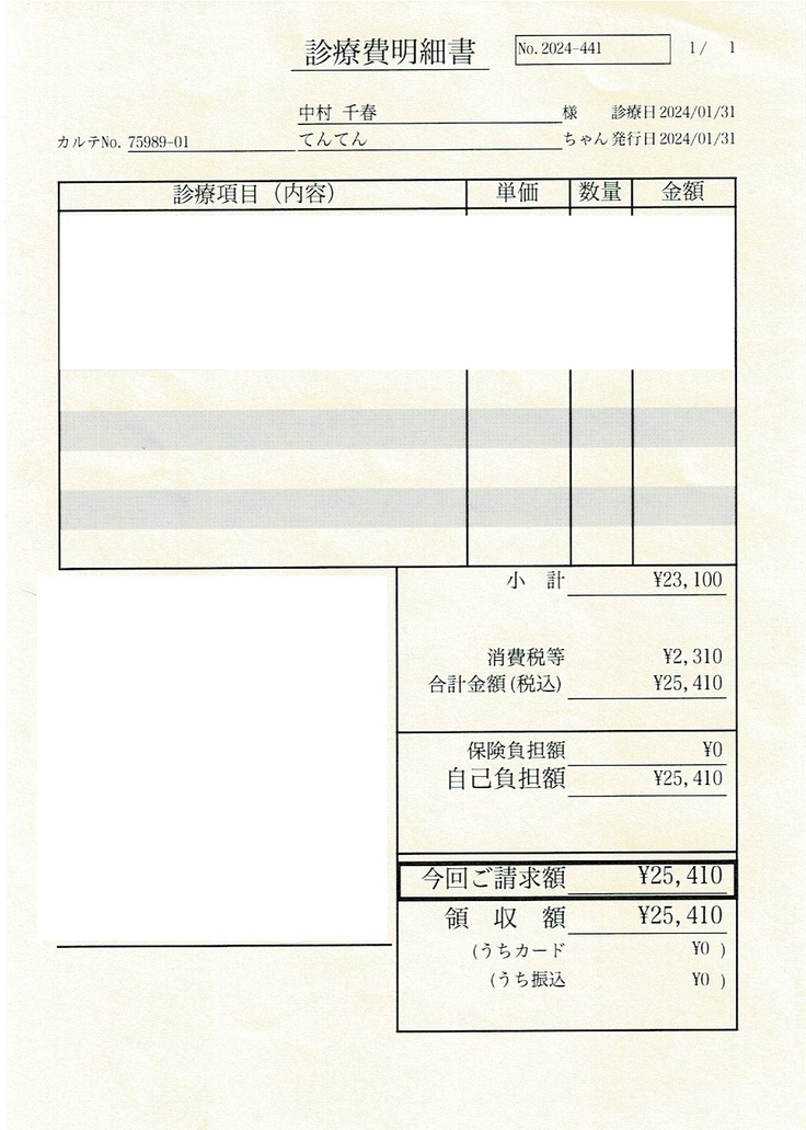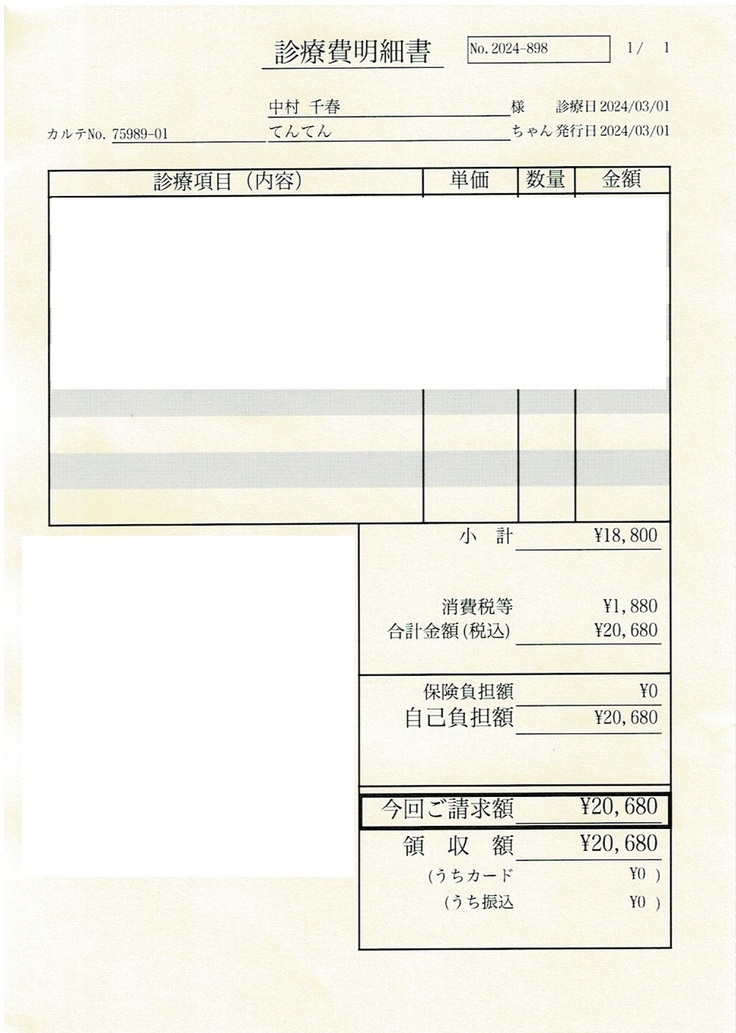 ページ上に掲載している診断書や診療明細書などの資料は、病院名等を控えることで動物病院から掲載の許諾を得ております。