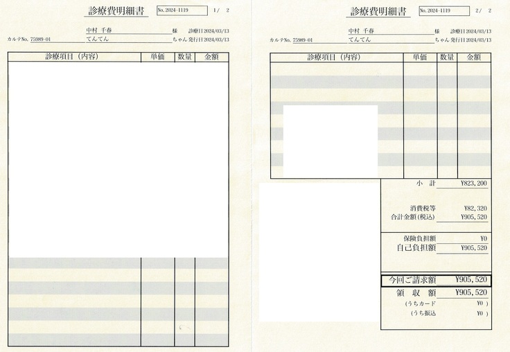 難しい手術ということもあり、費用が905,520円と、かなり高額になってしまいました。