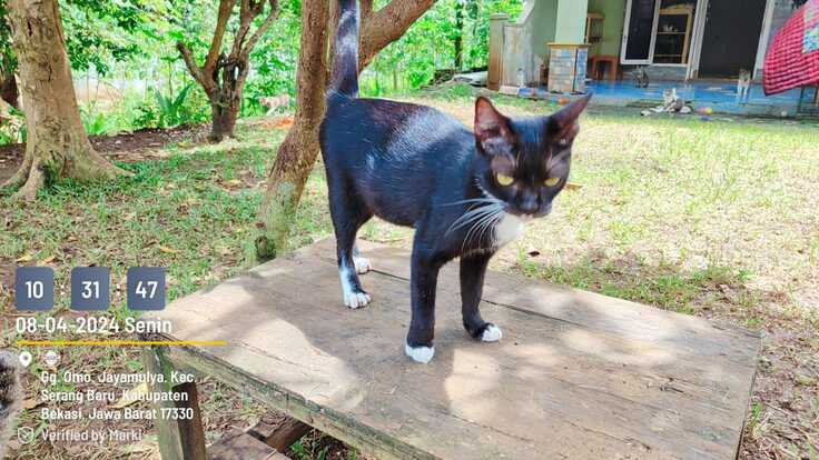 今日はナナちゃんです。昨日ご紹介したペペくんよりも長い間われわれと一緒に生活してきた保護第一号の女の子です。最初に出会ったのはちょうど5年前のいまごろで、首都ジャカルタからクルマで1時間ほどのとある屋台で、がりがりに痩せていました。さっそく、その屋台にいたほかのネコちゃんたちと一緒に缶詰めをあげたところ、彼女が一番食べました。そして、帰ろうとすると、駐車場までついてきて、連れて帰ってほしいとクルマに乗ろうとするので、仕方なく一緒に帰ることにしました。今から思うと人好きで甘え上手な彼女の特徴が、最初から発揮されていたのでした。アパートで一緒に暮らすようになってから数か月たつと、彼女の毛並みはだんだん艶が出てきて、身体もほどよく太り、美しい黒猫に変貌しました。手足の先と首元だけが白い、所謂タキシードブラックです。現在推定年齢は7歳くらいなので、キャットハウスで一番年長ということになりますが、身体は極めて丈夫で病気はしたことがありません。また、呼ばれたら必ず返事をしてくるほど賢く、基本的にキャットハウスの外で寝起きして、ご飯の時だけそれも2・3日ごとに戻ってくる生活を送っています。喧嘩に巻き込まれたり、病気に感染したりするのを避けているためと思われます。