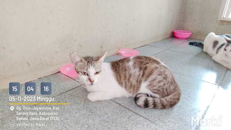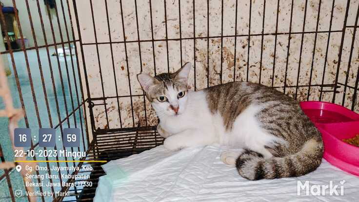 のりちゃんは、2021年の夏ごろ、やはりチカランのレストラン街のマレーシア料理店の前で生まれました。母はいまだにそのレストランの店員に可愛がられているミズキちゃん。名前は、ウェイトレスさんが姉のモチ(餅)とともに「海苔」にちなんでつけてくれました。最初の半年はモチとともにレストラン前で育ちました。生まれから歯並びが悪く、常に口内炎を罹患していたこともあり、小骨がある魚は苦手で、鶏レバーの水煮が好物でした。それでも、食欲不振に陥ることもなく、元気に育っていました。彼女に大きな災難が訪れたのは、ハウスに保護され1歳半を過ぎたころの23年春でした。慢性的な口内炎に加えて、何と猫エイズを併発してしまったのです。免疫力が弱まり、身体も痩せていく症状は、人間同様でインドネシアにも有効な薬はないといわれています。局所的な治療で凌いでいくしかないといわれ、やむなくハウスで療養することにしました。しかし食はだんだん細っていき、再度獣医に相談したところ、まず口内炎は解消したほうがいいといわれ、もともと並びが悪かった歯をすべて抜く決断をしました。信じられないですが、ねこの場合、歯はなくても食事には支障ありません。ノリの命のため全歯抜歯を敢行したところ、何と食がだんだん戻ってきたのです。この間約半年、狭い檻の中での生活にも耐え、不治の病エイズの病魔にも耐え、すこしづつ元気になっていくではありませんか。この時の喜びはいつまでも忘れられません。今ではすっかりエイズも完治して、食べ過ぎのためか少し太りめになって元気な毎日を送っています。そんな不死身のノリちゃんをぜひ応援してください。