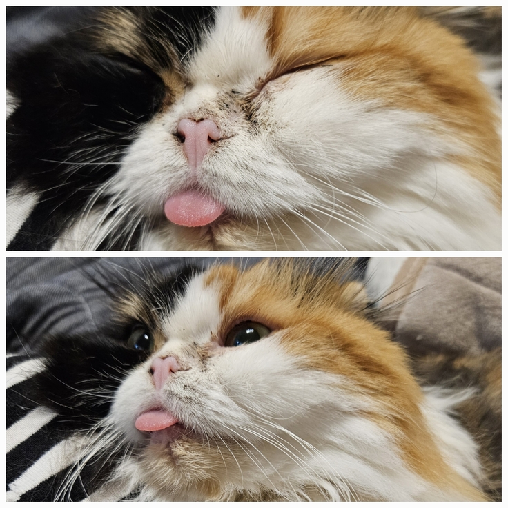 慢性鼻炎で、酷くなると点鼻点眼薬も、生後2ヶ月の頃から一緒です。来た頃は、カビ、肺炎で大変でした。免疫力の弱い私だけカビ菌が、移り顔に、100個以上の湿疹が……私も、完治するまで大変でした。この🐱ショコラちゃんが、私に生きる力を与えてくれた