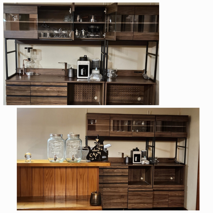 厨房も ほぼ揃い、食器棚に、カップやグラス、ポットなど