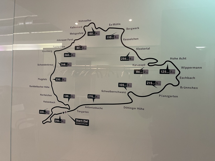 ストレートエンドが270km/hなのはニュルブルクリンクの自主規制だから妥当ですけど、森の中の高速S字滝下りフックスルーレが260km/h、ポツンと一本道的なクロスタータールも260km/h、なににもまして、高速下りをプレーキング旋回させられるシュウェーデンクライツが268km/hなのはヤバイかもしれないですね。
