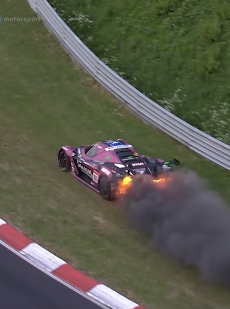 無人のマシンが燃えながら走る。まるで恐怖映画のワンシーンみたいですけど、ニュルブルクリンクでは珍しくないんですね。トラブルでマシンが発火。慌てたドライバーが飛び降りる。マシンは転がり始めグングンと速度をあげる。ノルドシュライフェはたいがい急坂ですからね。だから逃げ出すときはギア派を1速で……。